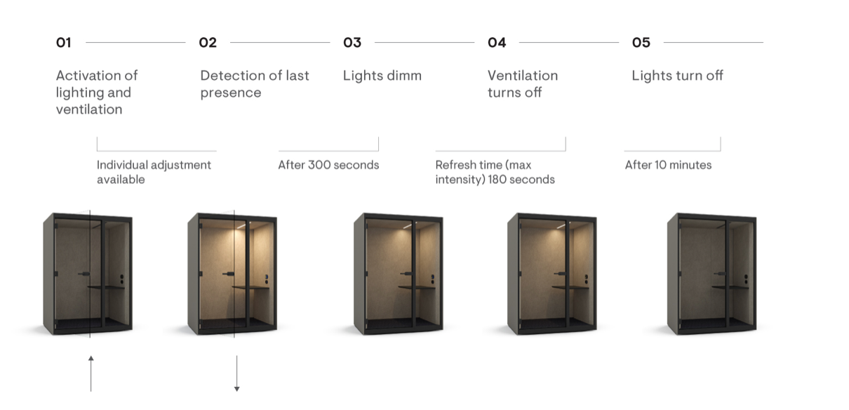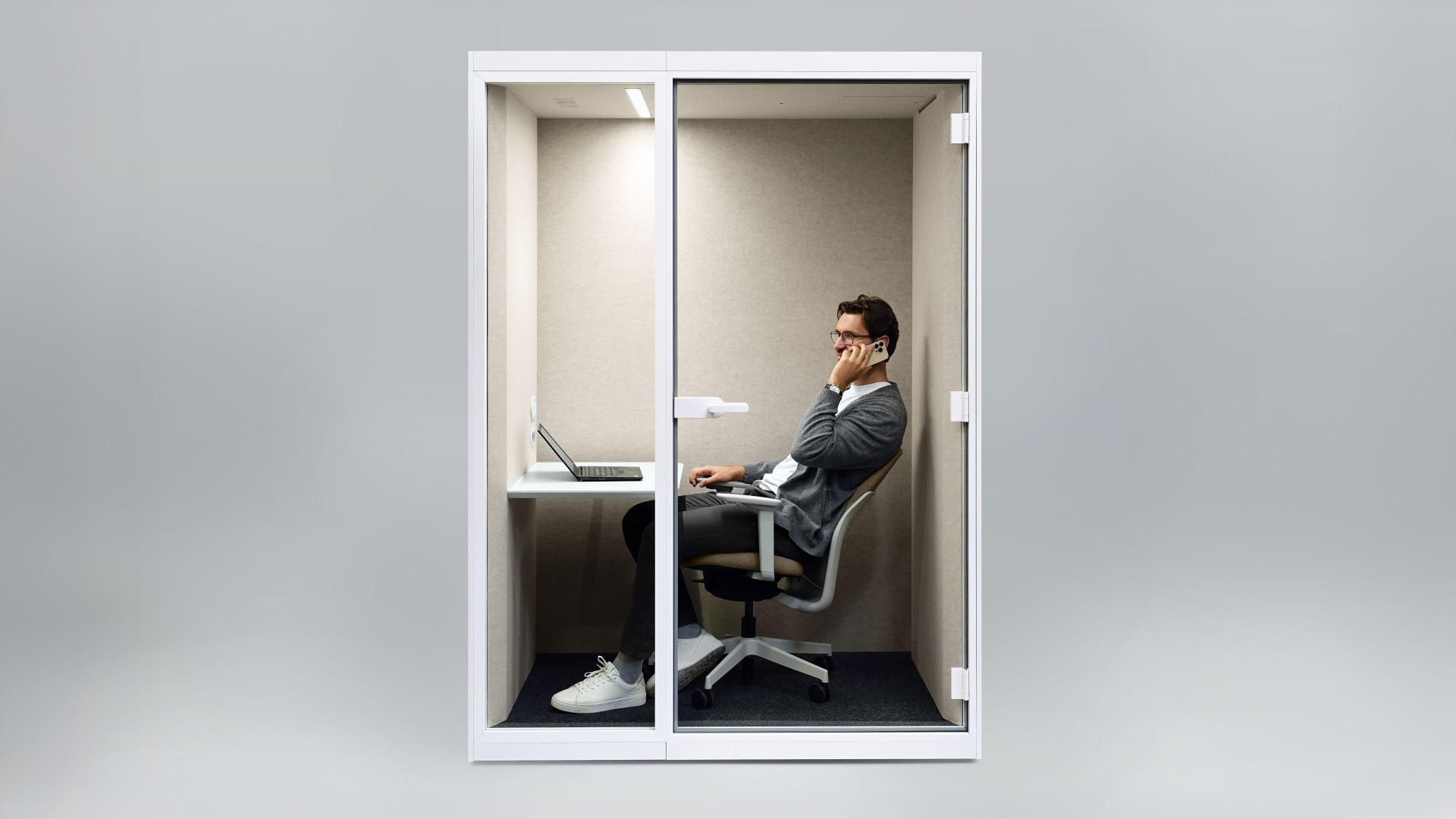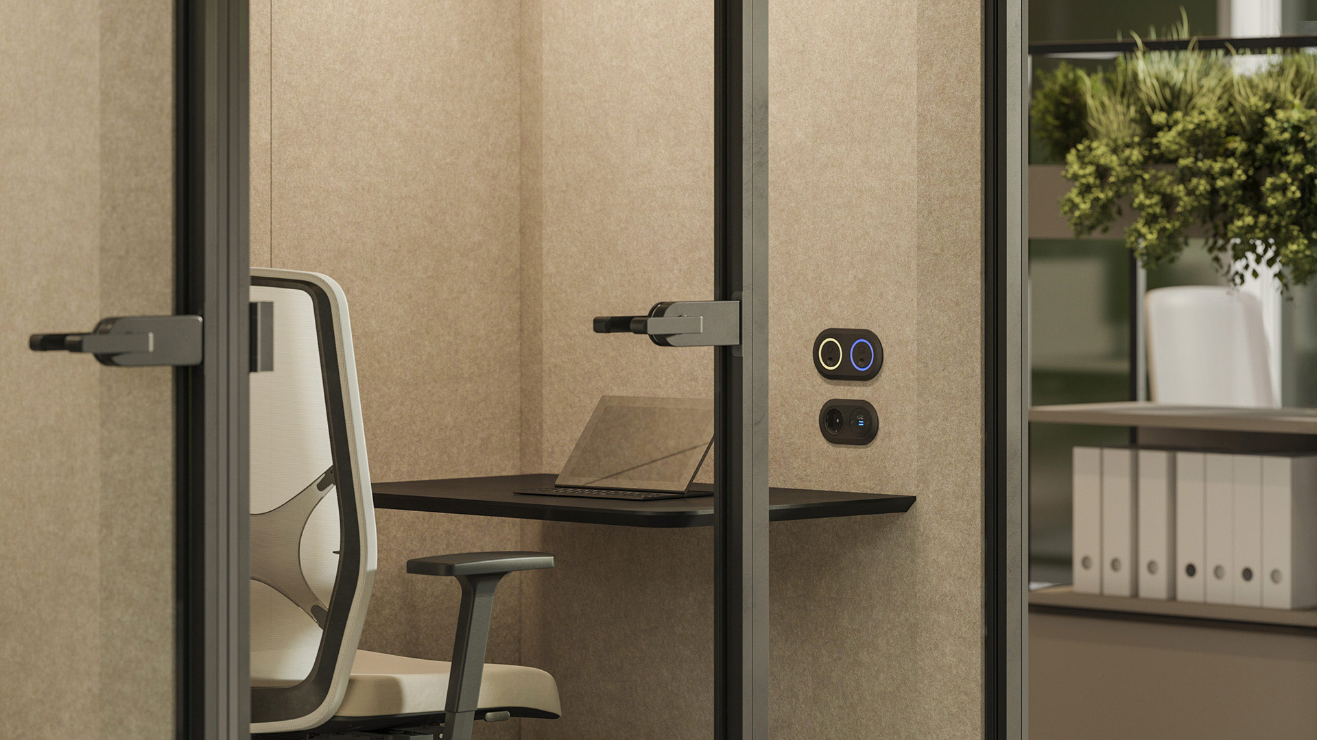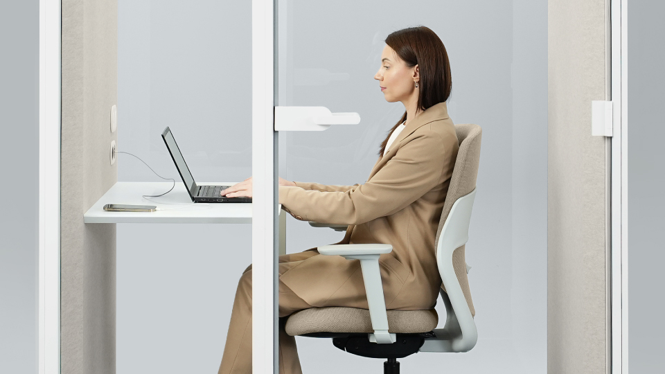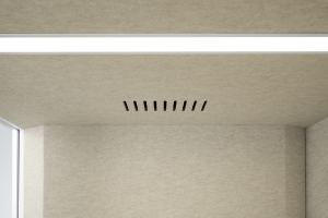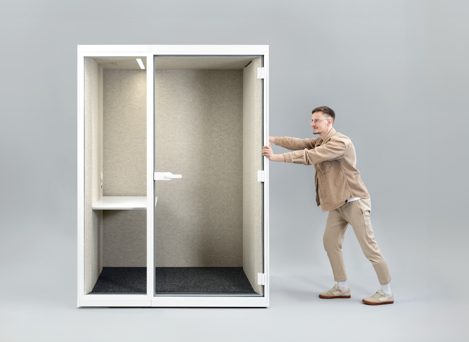 Cabinele acustice SONUS S+ oferă o izolare fonică excelentă, încadrată în clasa B conform standardului ISO 23351-1:2020. Odată închisă ușa, zgomotele ambientale sunt eliminate, iar conversațiile rămân confidențiale, oferind o atmosferă de lucru calmă și concentrată.