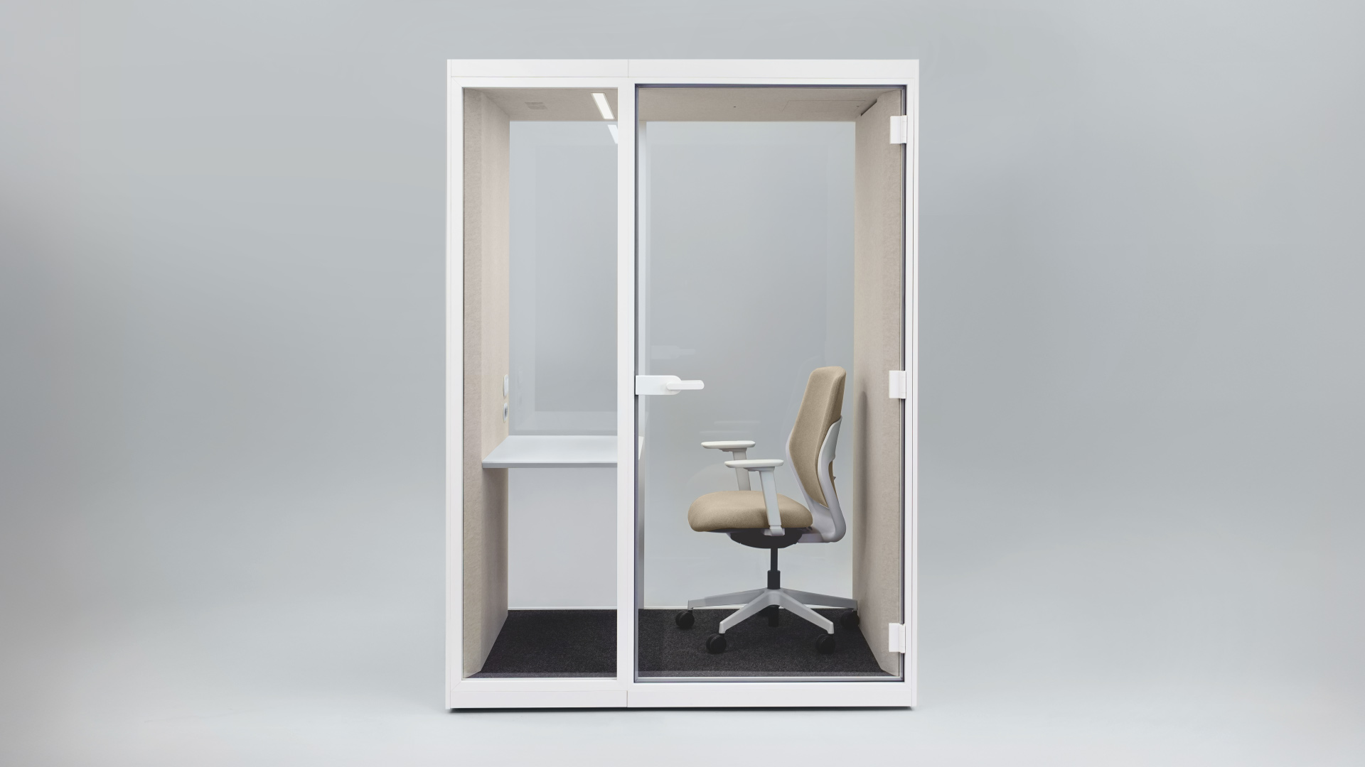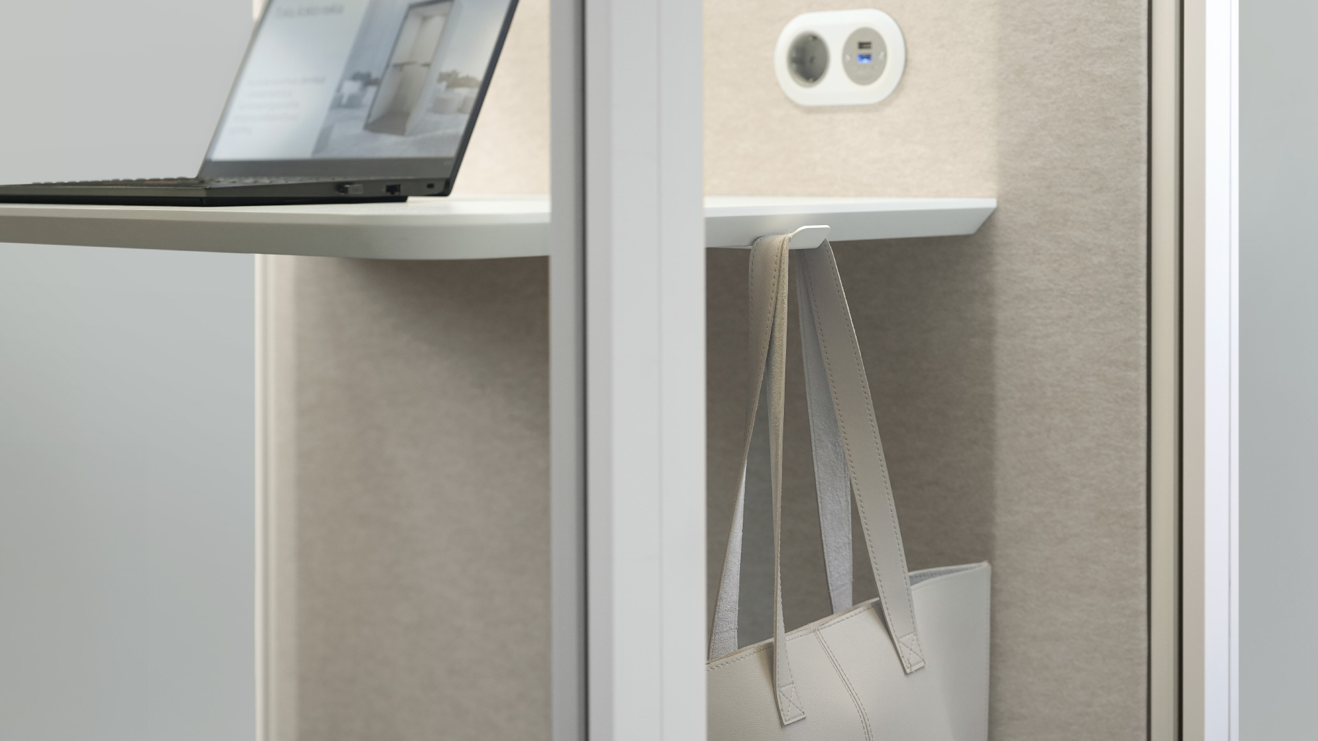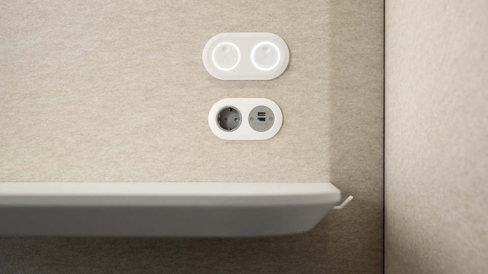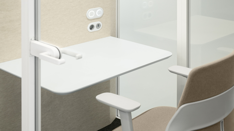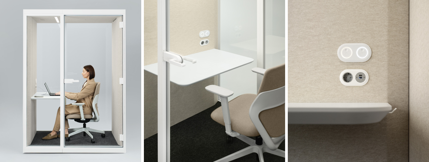 Interiorul spațios al SONUS S+ permite utilizarea unui scaun ergonomic și oferă suficient loc pentru activități individuale sau întâlniri scurte. Blatul generos oferă loc pentru organizarea accesoriilor, iar cârligul integrat pentru geantă sau rucsac menține ordinea în interior.