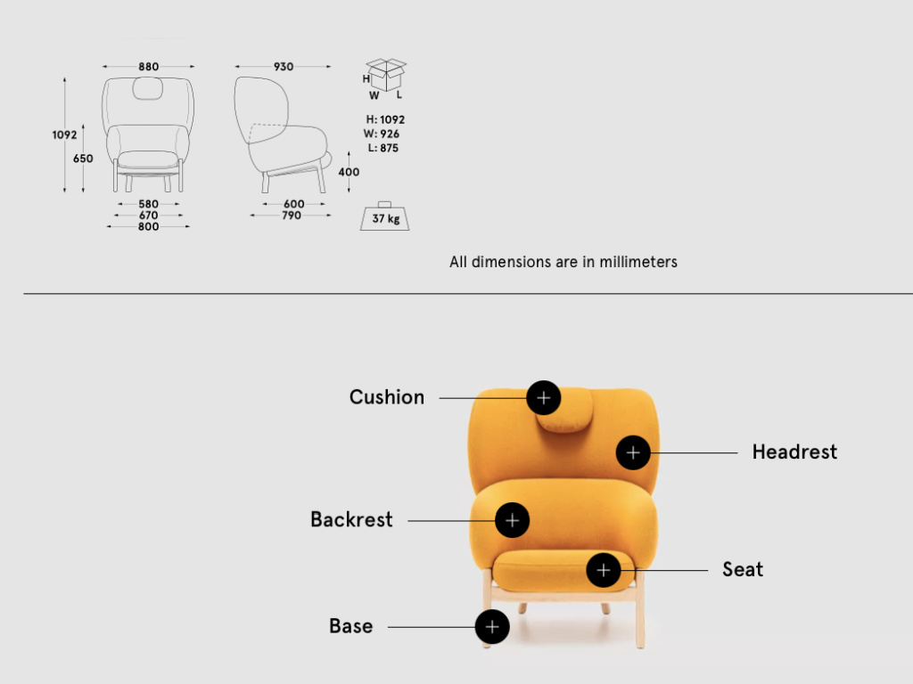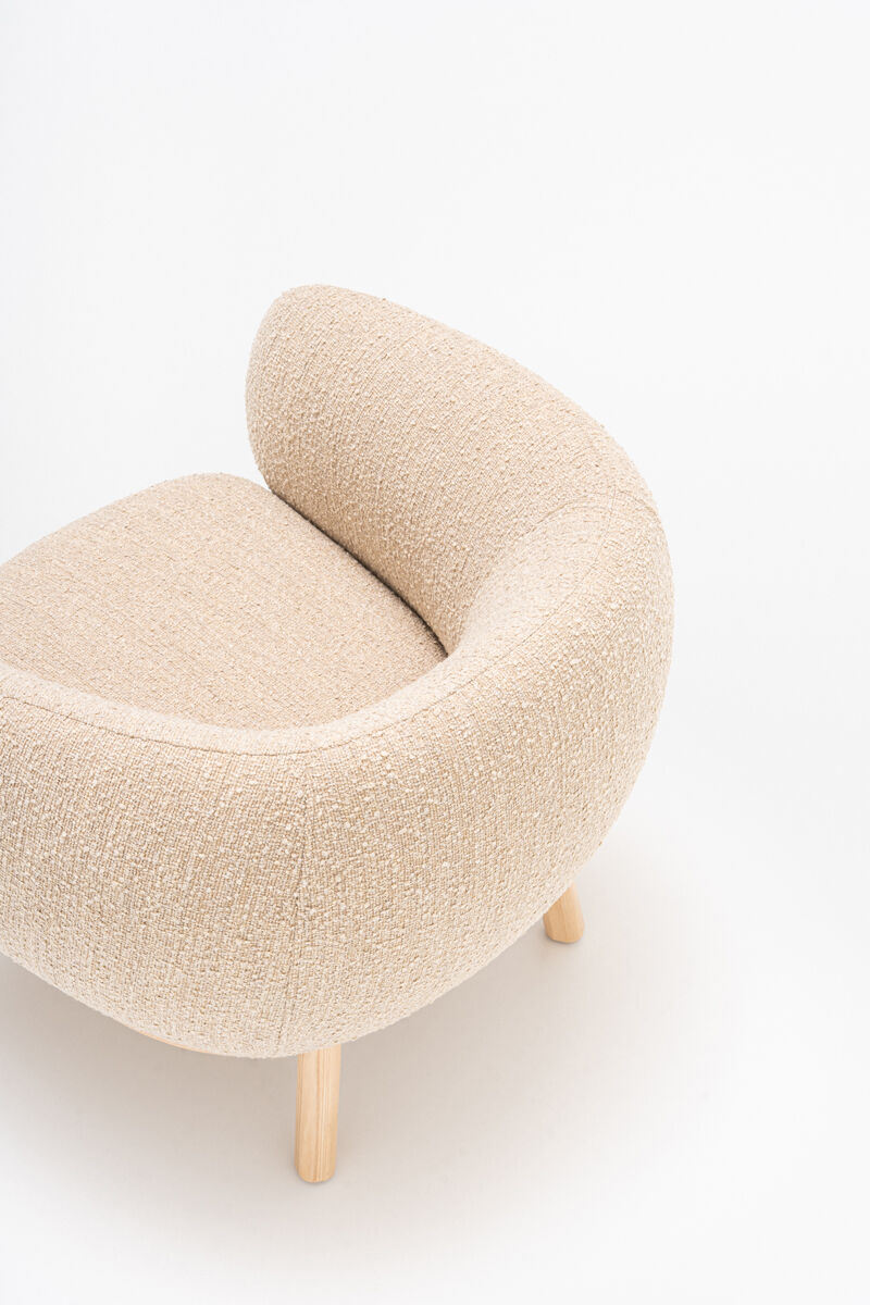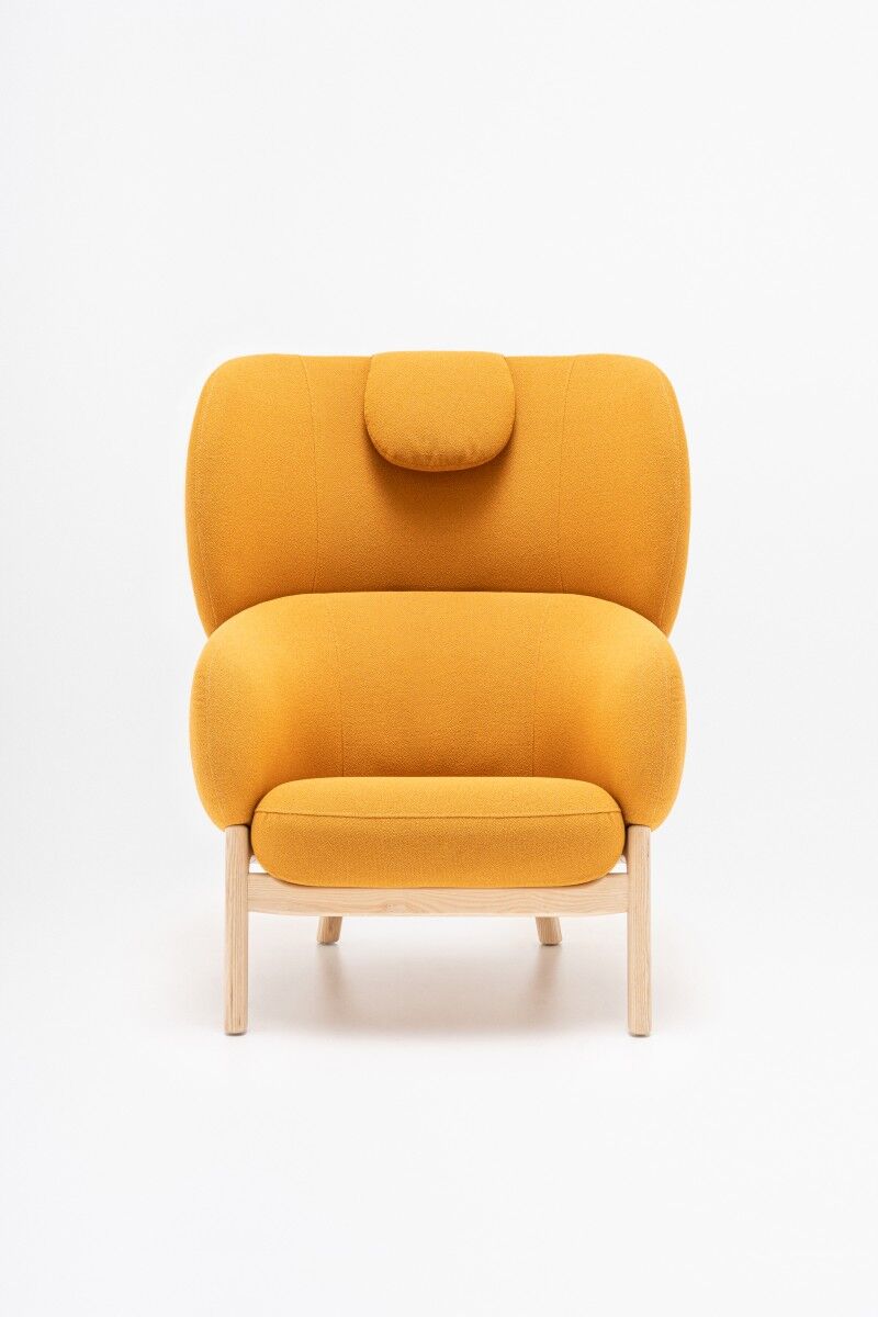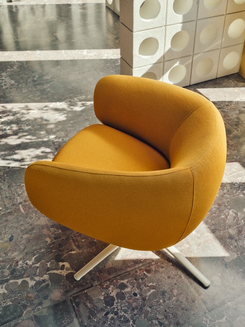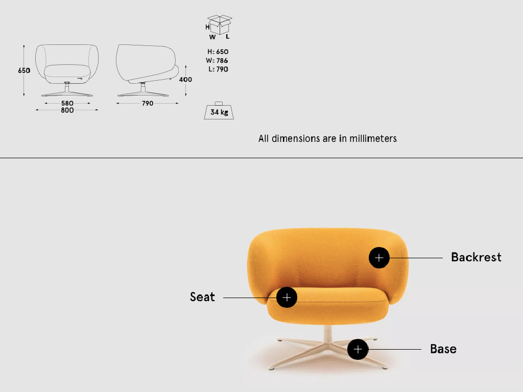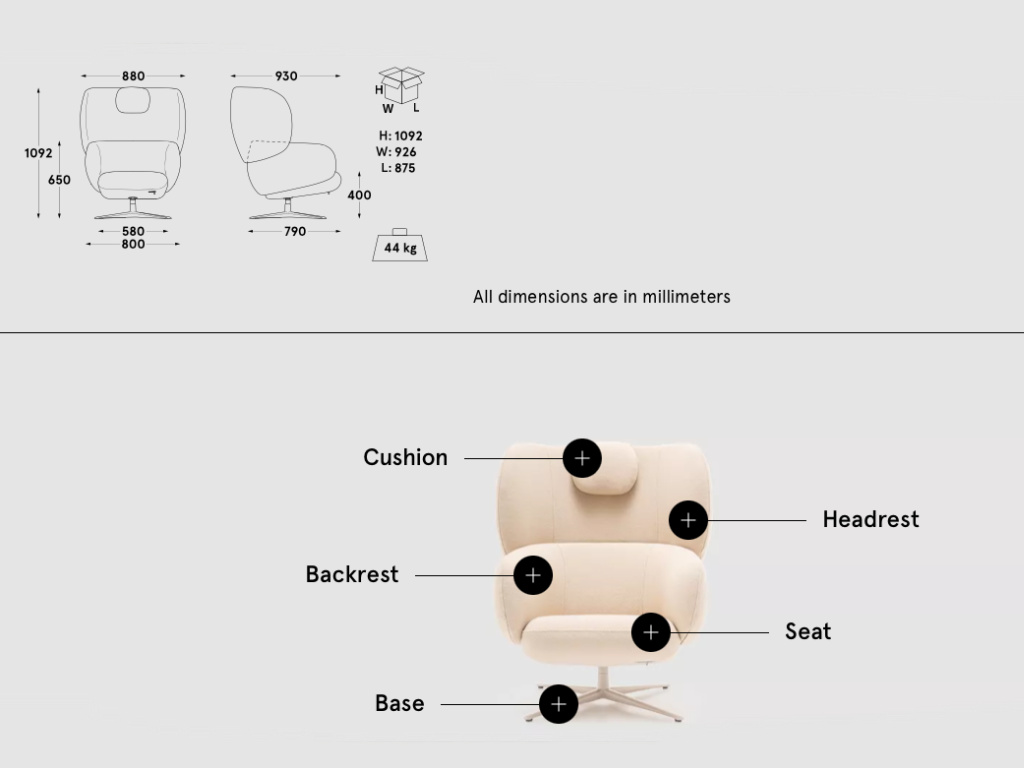 Contrastul dintre forma moale, tapițată, și baza metalică conferă fotoliului un caracter modern și permite integrarea acestuia atât în interioare contemporane, cât și în spații cu amenajări mai clasice.