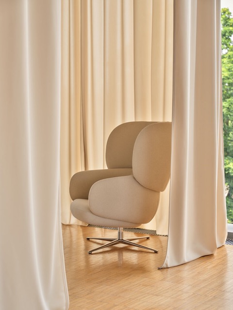 Fotoliul Grand Grace este un adevărat fotoliu lounge! Jos, lat și moale, învăluie utilizatorul și îl invită să se relaxeze. Tetierele tapițate, integrate în spătar, creează o zonă semi-privată, oferind intimitate și protecție fonică.