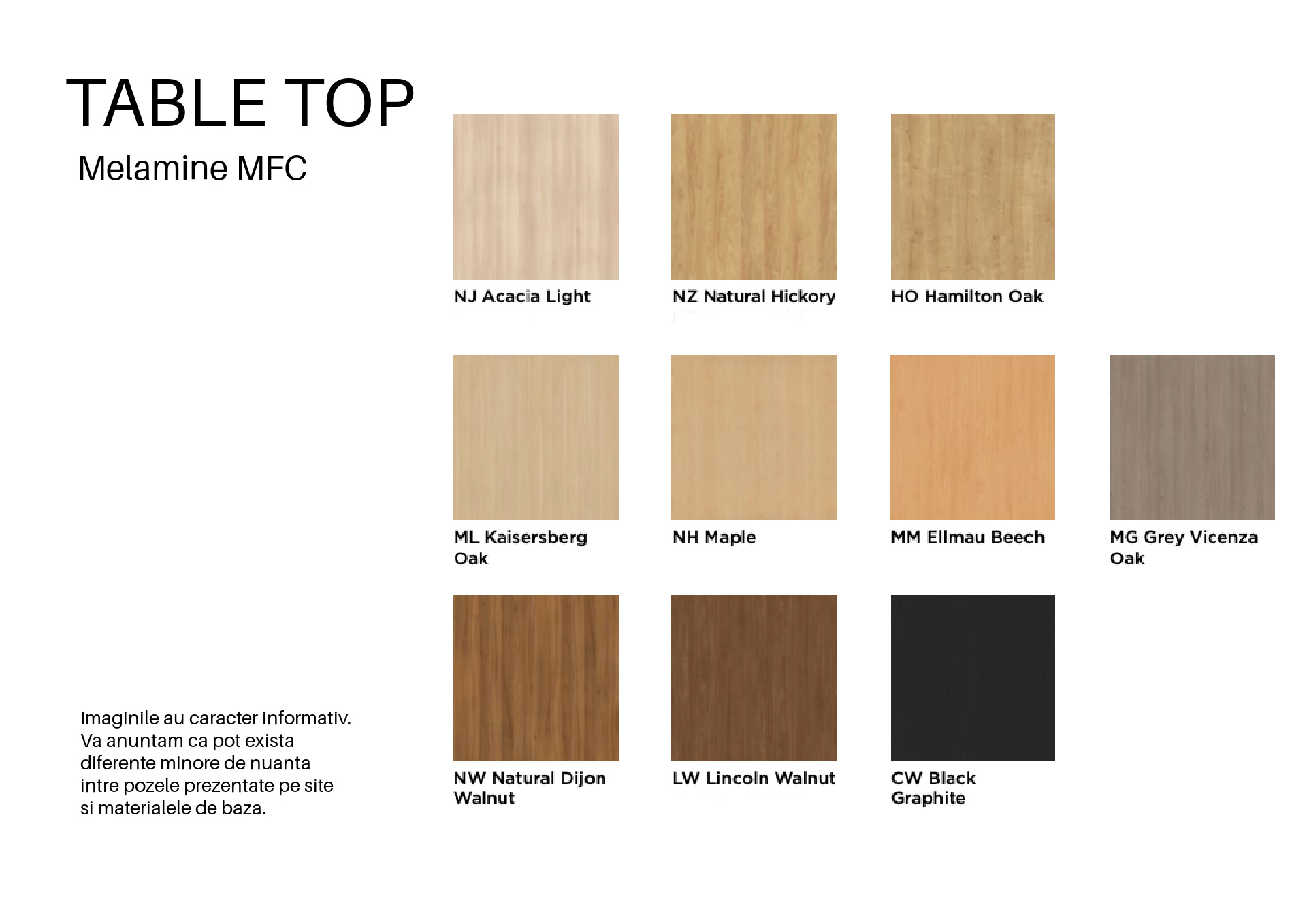 Blatul este disponibil în finisaje variate — metal, melamină sau Fenix — iar înălțimea este reglabilă: 560÷750mm, adaptându-se perfect la scaune de întâlnire sau fotolii lounge.